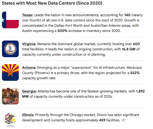 None of these markets have seen significant growth of large AI data center campuses. Noticeably absent from the list of states experiencing the highest increase in utility costs are the 5 states below.